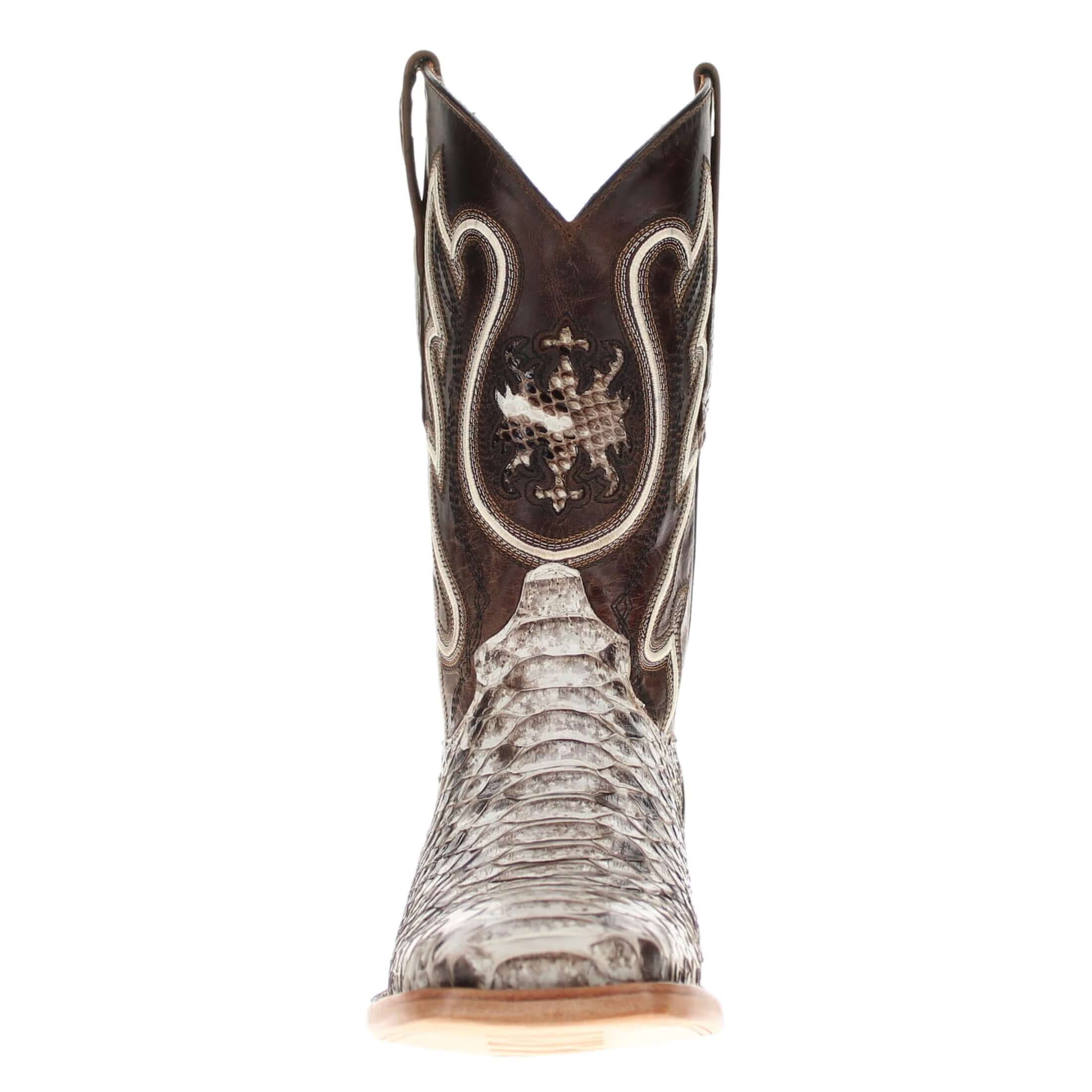 These men's cowboy boots are a statement of luxury and style. The Crockett boots feature genuine python vamps, intricate hand-cording detail, and python inlaid accents for a touch of sophistication and exotic flair. These boots are perfect for those looking for a unique and high-end addition to their cowboy boots collection.